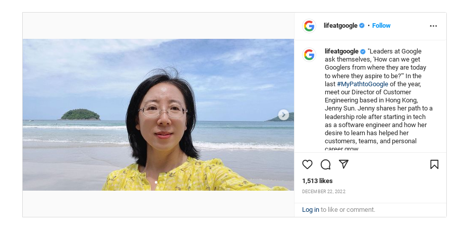 - Dipendenti: i tuoi dipendenti possono anche essere una risorsa affidabile per promuovere il tuo marchio e incrementare le vendite. Un ottimo esempio di utilizzo dei dipendenti come ambasciatori del marchio è Google. In questo post di Instagram, Google utilizza l'immagine di Jenny Sun, direttrice del Customer Engineering con sede a Hong Kong, come ambasciatrice del marchio per motivare gli altri dipendenti: