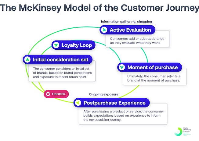 Il content marketing può avere un enorme impatto sul percorso del cliente. Il modello McKinsey mostra le quattro fasi di un ciclo in cui le persone decidono un acquisto.