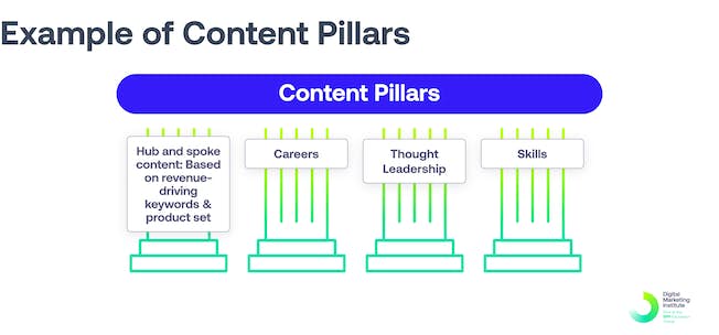Suggerimento da parte di DMI: decidere su quattro pilastri aziendali chiave. Alcuni saranno legati al marchio, come la leadership di pensiero, altri saranno commerciali. Dovrebbe esserci una combinazione di due, non più di quattro, e tutti i tuoi contenuti dovrebbero rientrare in ciascuno di questi pilastri.