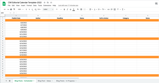 Ad esempio, il team editoriale di CMI utilizza un tracker multitab simile al modello del calendario editoriale riportato di seguito. Il processo per la gestione dei contenuti programmati viene tracciato nella scheda principale, mentre le idee di brainstorming e le attività di pre-produzione ottengono le proprie schede. Ogni campo è specifico per le attività richieste per quelle parti del processo.