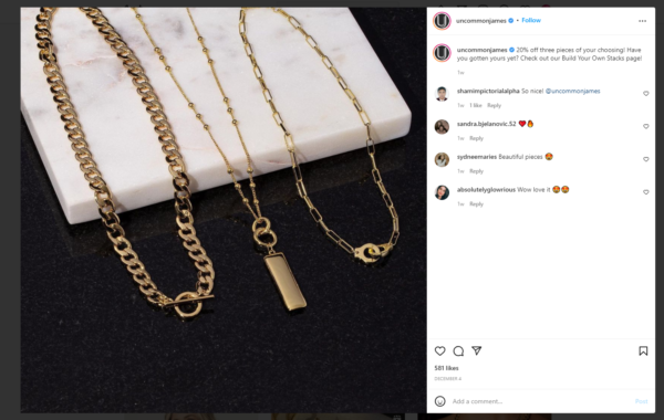 Uncommon James, un marchio di gioielli e articoli per la casa fondato dalla star dei reality Kristin Cavallari, include post di gioielli degni di una rivista sia sui modelli che in mostra nel suo feed di Instagram. Questo dà agli utenti una buona idea di come sarebbe ogni pezzo una volta indossato.