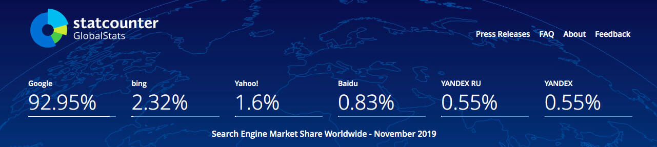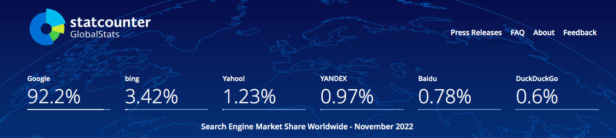 Una ricerca di StatCounter mostra che circa il 92% di tutto il traffico sui motori di ricerca proviene da Google. Anche se piccoli, vale la pena notare i cambiamenti dal 2019 al 2022 : la quota di mercato di Google è scesa di quasi l’1%, mentre quasi tutti gli altri motori di ricerca sono cresciuti:
