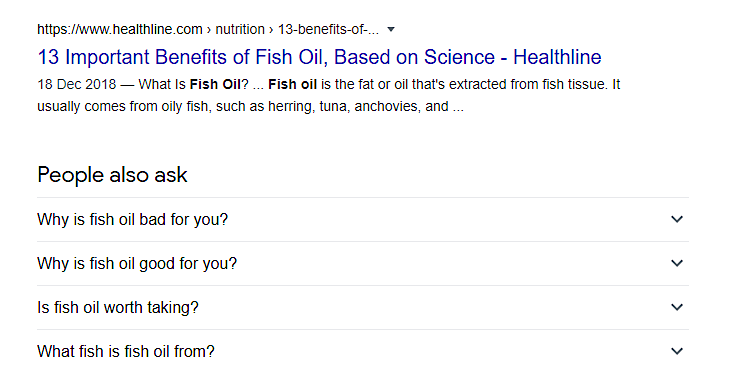 Google capisce cosa cercano le persone e quale tipo di contenuti soddisfa al meglio le loro intenzioni. Ad esempio, se cerchi "olio di pesce", Google sa che l'intento di ricerca dominante è conoscere i benefici per la salute e gli effetti collaterali: