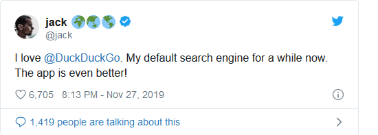 Detto questo, DuckDuckGo – un motore di ricerca incentrato sulla privacy fondato nel 2008 che ha guadagnato una popolarità di nicchia tra gli utenti attenti alla privacy – ha recentemente fatto scalpore con il suo slogan “il motore di ricerca che non ti traccia” perché “i motori di ricerca non è necessario monitorare gli utenti per fare soldi."