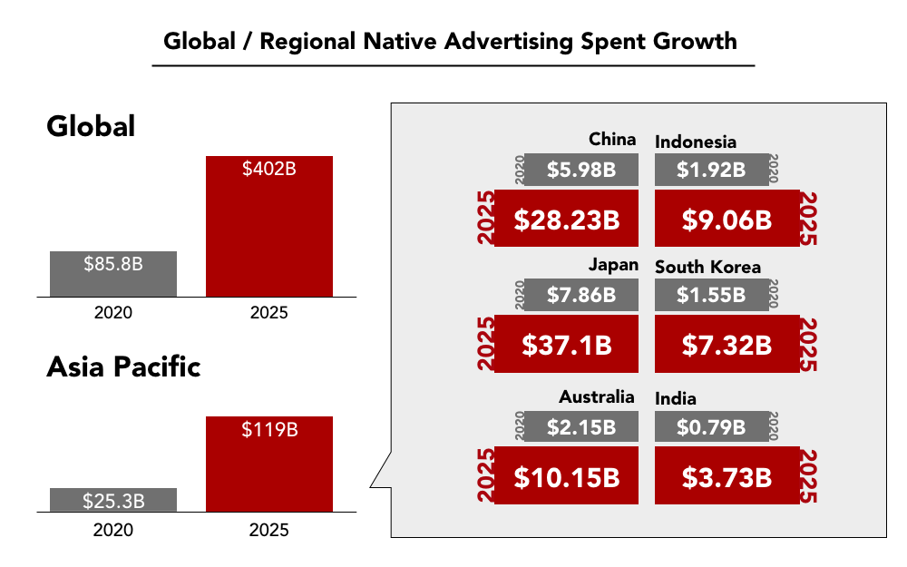 ADYOULIKE ha rivelato che si prevede che la spesa per la pubblicità nativa aumenterà da 85,83 miliardi di dollari a un valore globale totale di 402 miliardi di dollari entro il 2025, ovvero un aumento del 372%: