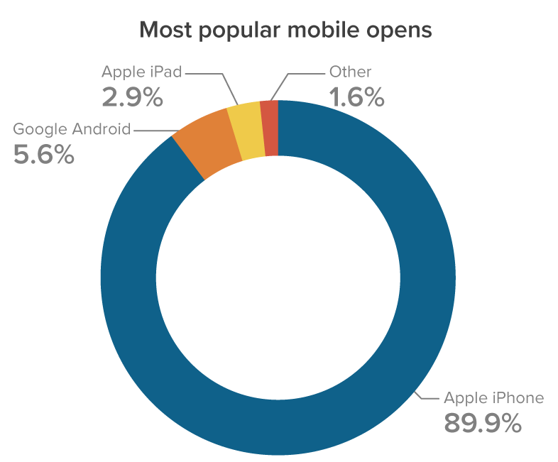 Detto questo, una buona parte della quota di iPhone è stata presa da ciò che chiamiamo "Apple Mail Privacy" - tutte le aperture sono influenzate da MPP - che rappresenta il 6,6% della quota di mercato dei client di posta elettronica (attualmente al quarto posto). Se assumiamo che questi provengano tutti dall'iPhone (dato che la quota dell'iPad è così piccola e macOS Monterey con MPP non è ancora stato rilasciato), allora Apple iPhone sarebbe comunque al primo posto.