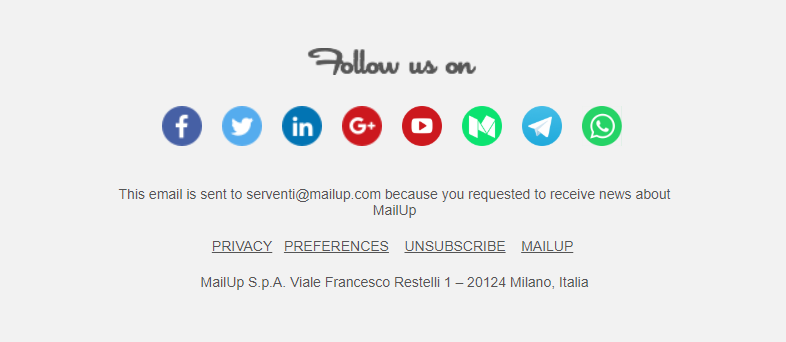 Questa è la sezione a piè di pagina che risponde alla domanda " Perché ricevo questa email? ” È anche una best practice in termini di deliverability, poiché riduce ulteriormente i reclami di spam e aiuta a mantenere la tua reputazione come mittente. Un esempio di promemoria di autorizzazione? “ Hai ricevuto questo messaggio perché sei iscritto al blog di MailUp” .