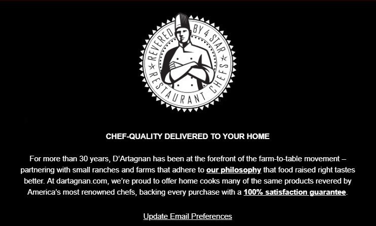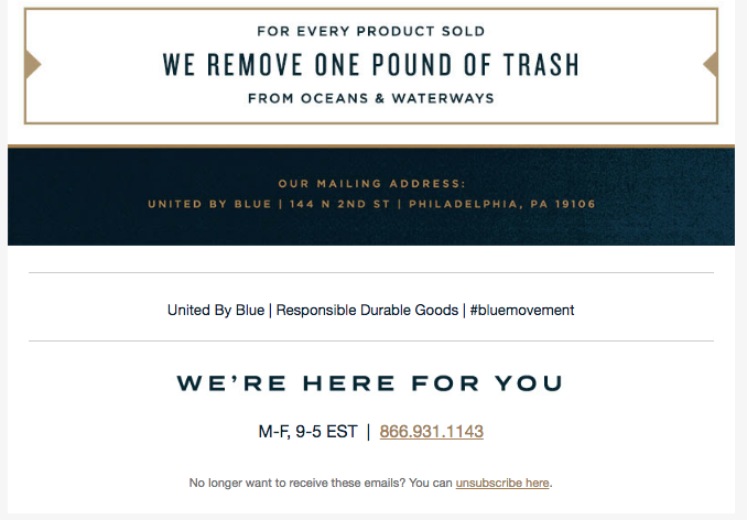 Due aziende usano particolarmente bene i loro slogan nel footer: uno è United byBlue, azienda di attrezzature per l'outdoor, che chiude le sue email con una dichiarazione di intenti per l'ambiente . Il footer è ben strutturato grazie a una composizione modulare, e dispone le informazioni in un modo gerarchico, ordinato e di facile consultazione.