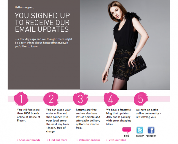In questo esempio, il rivenditore britannico House of Fraser fornisce un'introduzione ai suoi nuovi ospiti con questa e-mail di benvenuto amichevole e organizzata: