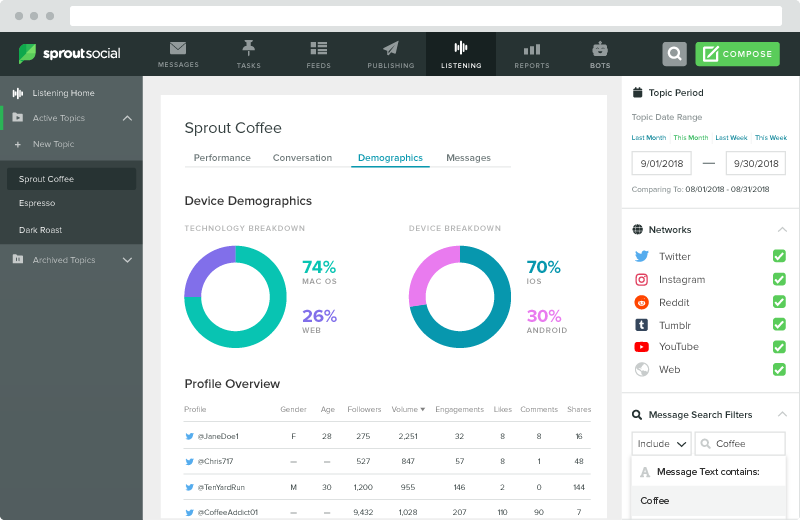 En Sprout Social contamos con herramientas que facilitan la Escucha Activa en tus redes sociales y el analisis en tiempo real y continue de temi, marcas, hashtags e industrias.
