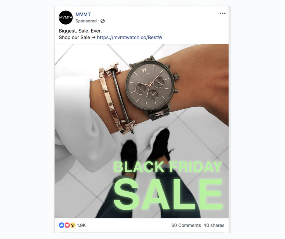 Stai facendo uno sconto del 50% sulla vendita? Offrire la spedizione gratuita questo fine settimana? Se hai un messaggio diretto che vuoi trasmettere rapidamente, un singolo annuncio illustrato può fare proprio questo. Senza nulla da guardare o scorrere, il tuo messaggio può essere immediatamente compreso dai potenziali acquirenti. Ciò è particolarmente utile per il retargeting di visitatori passati, clienti e abbonati e-mail.