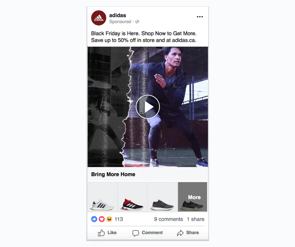 L'annuncio della raccolta è il formato più recente disponibile, quindi potresti non averne visti molti nel tuo feed di notizie. Tuttavia, gli annunci di raccolta hanno un grande potenziale per i marchi di e-commerce grazie alla loro capacità di accoppiare un catalogo prodotti con un video coinvolgente.