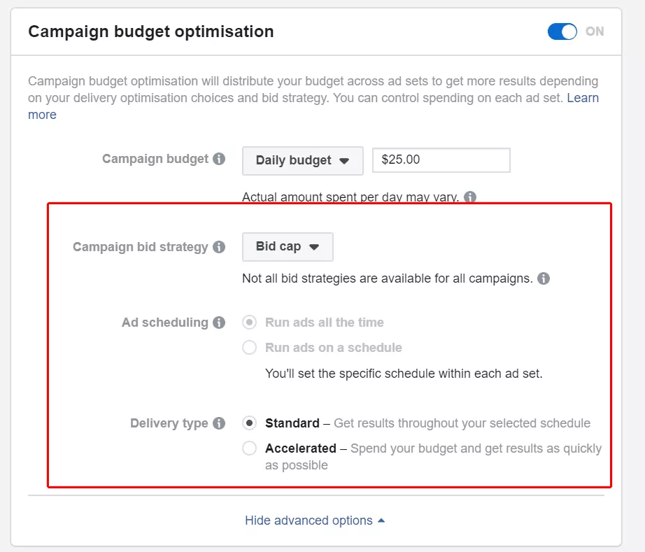 Facebook ha apportato alcune modifiche radicali alla sua piattaforma pubblicitaria per ottimizzare gli annunci per tuo conto. Le strategie di offerta disponibili forse per gli inserzionisti più avanzati. Quindi, se non conosci questo, prova a mantenere le impostazioni su "Costo più basso" e "Tipo di consegna standard" all'inizio, quindi apporta piccole modifiche per vedere se ottieni risultati migliori.