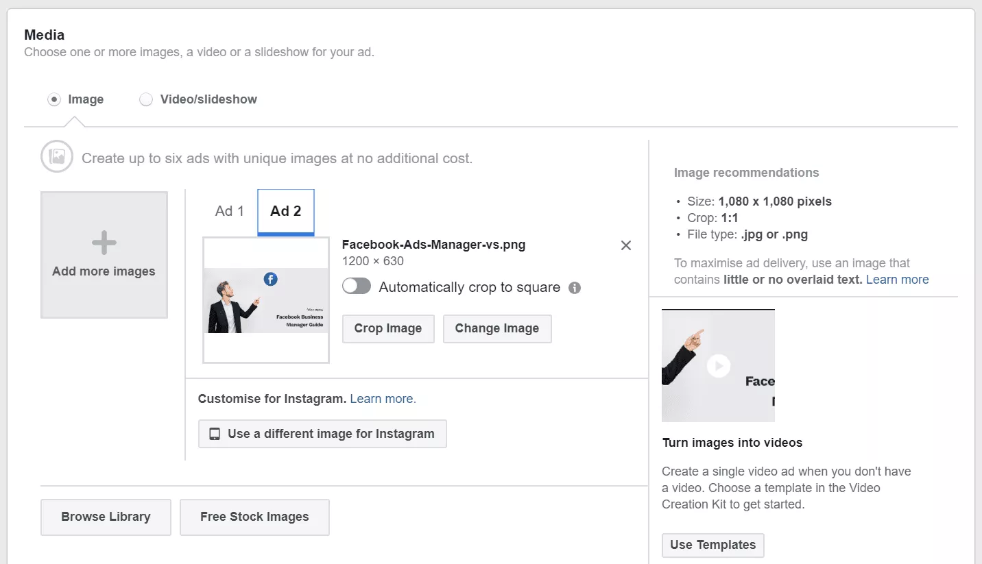 Nel caso in cui ti senti bloccato per le idee pubblicitarie, puoi sfogliare le "immagini di riserva gratuite" di Facebook o fare clic su "Utilizza modelli".