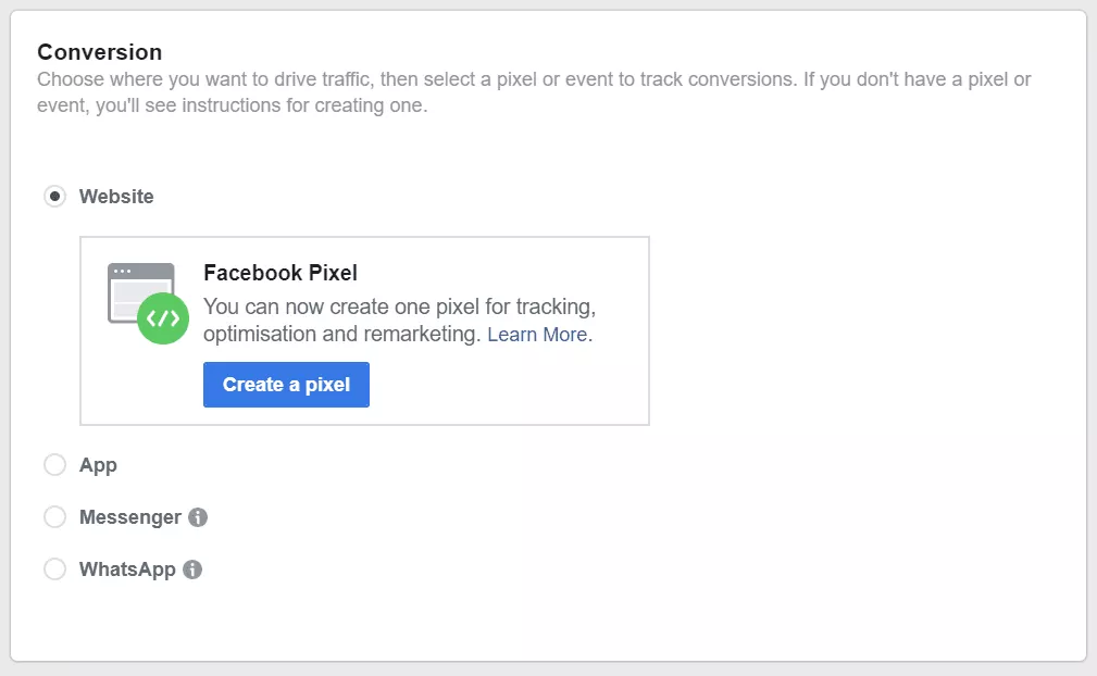 Se scegli "Sito web", "Messenger" o "WhatsApp", dovrai installare il Pixel di Facebook per il monitoraggio, l'ottimizzazione e la segnalazione. Puoi imparare come installare il pixel di Facebook su un sito Web WordPress leggendo questo articolo o saperne di più sul Pixel qui .