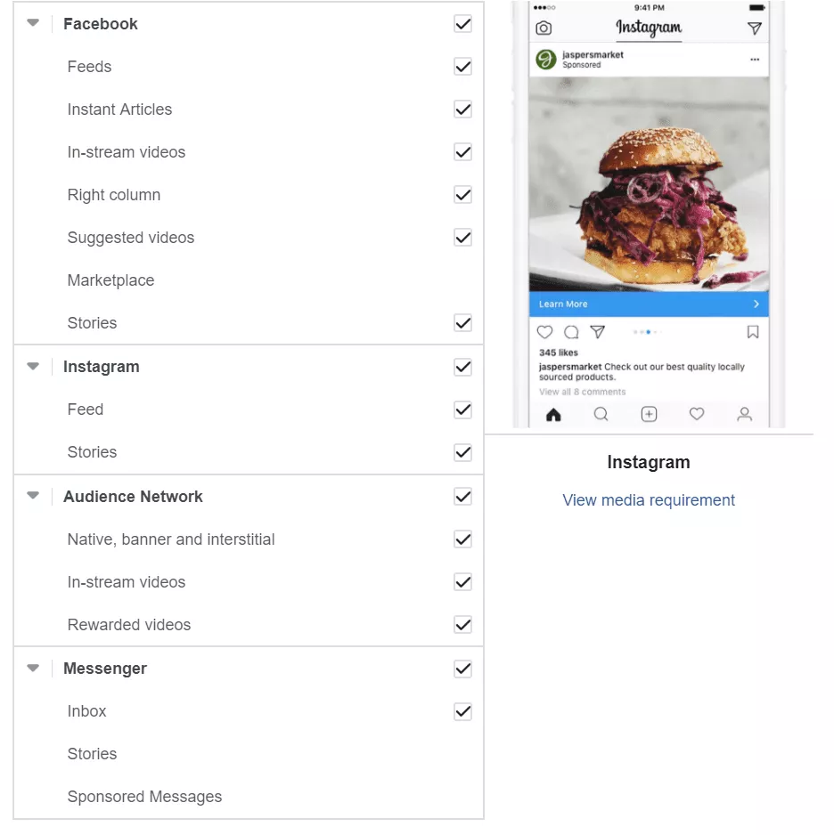 Infine, puoi visualizzare l'anteprima del tuo annuncio in tutti i posizionamenti in cui hai scelto di pubblicare il tuo annuncio. In totale, ci sono 19 diversi posizionamenti, che puoi sfogliare 1 per 1: