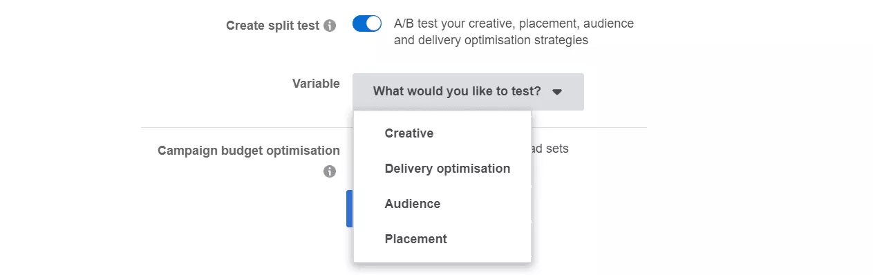 Sotto l'opzione per dividere il test c'è l'opzione per aggiungere "Ottimizzazione del budget della campagna". Tieni presente che non puoi attivare sia "Split Test" che "Ottimizzazione del budget". Devi scegliere l'uno o l'altro.
