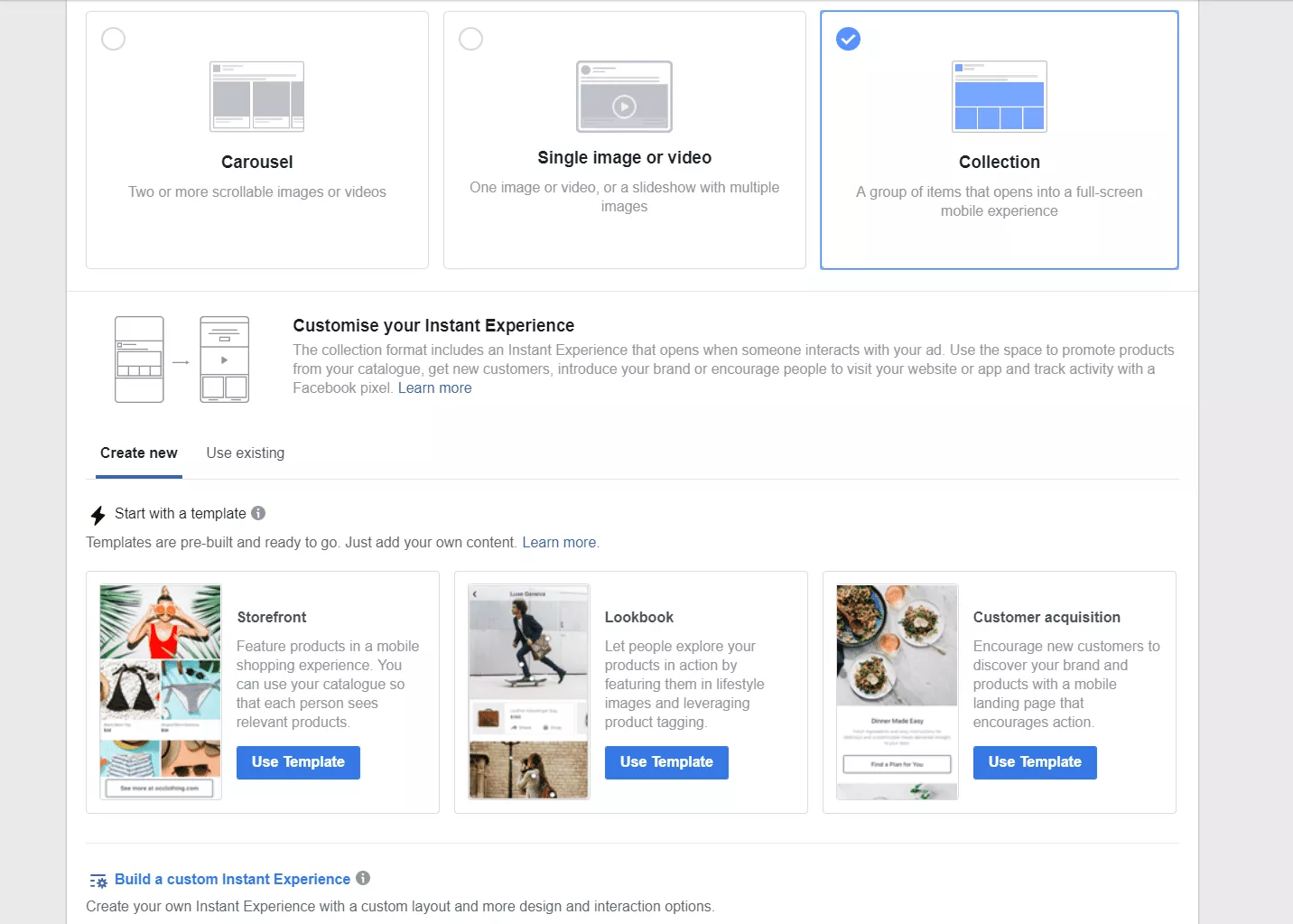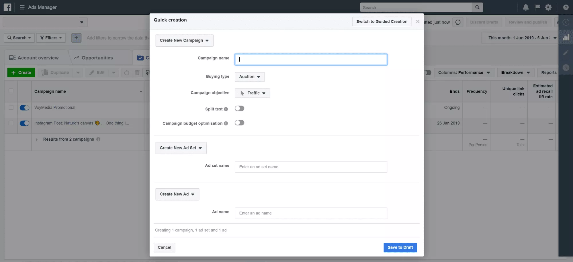 Entrambi ti guideranno attraverso la creazione di una campagna Facebook e, per questa guida, ti mostreremo come impostare le cose utilizzando la Creazione guidata (che consigliamo agli inserzionisti per la prima volta).