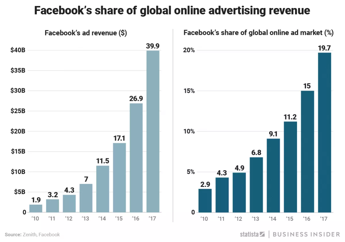 Nel 2019, Facebook ha 1,56 miliardi di utenti attivi che controllano la piattaforma quotidianamente. Non è un segreto che il potenziale pubblicitario di Facebook abbia portato a una quota così consistente delle entrate pubblicitarie del mercato globale.