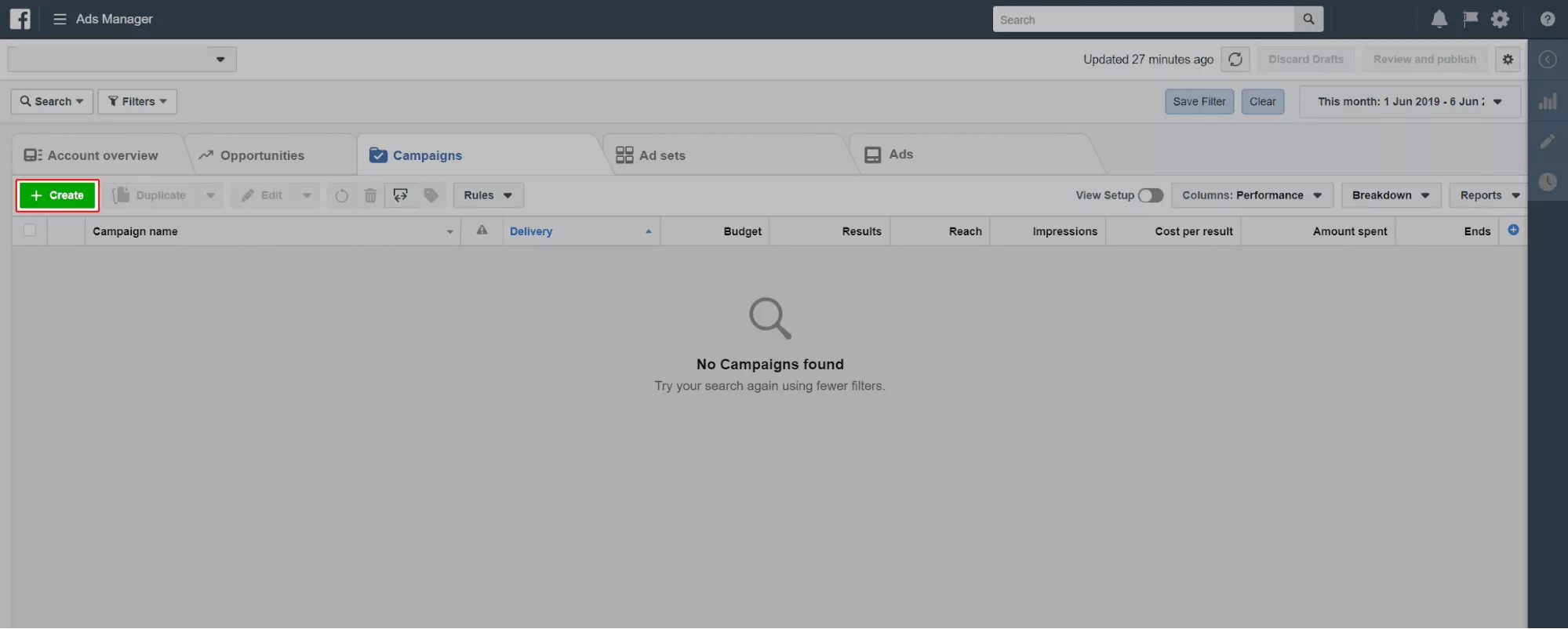 Per creare la tua prima campagna pubblicitaria, fai clic sulla scheda "Campagne" in Gestione inserzioni di Facebook. Quindi, fai clic sul pulsante verde "+ Crea".