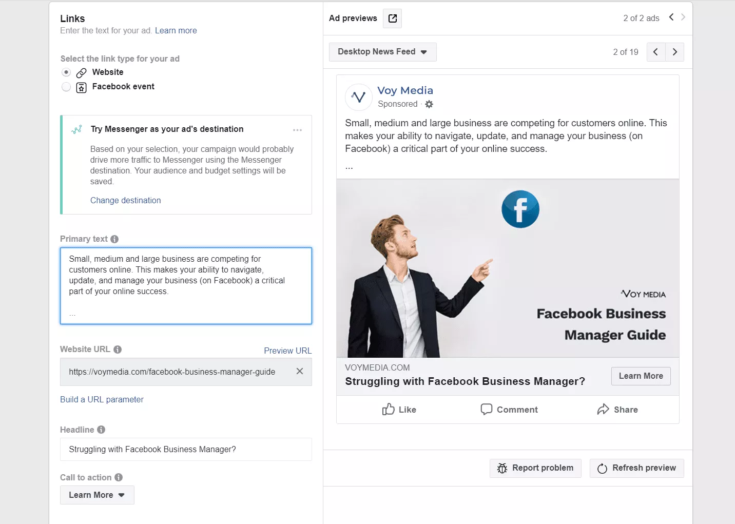 A questo punto, dovresti essere pronto per andare su Gestione inserzioni di Facebook. Se desideri ulteriore assistenza o desideri discutere i modi in cui VoyMedia può gestire i tuoi annunci e aiutarti a scoprire nuovi tesori nel vasto mare di dati digitali, inviaci un messaggio !