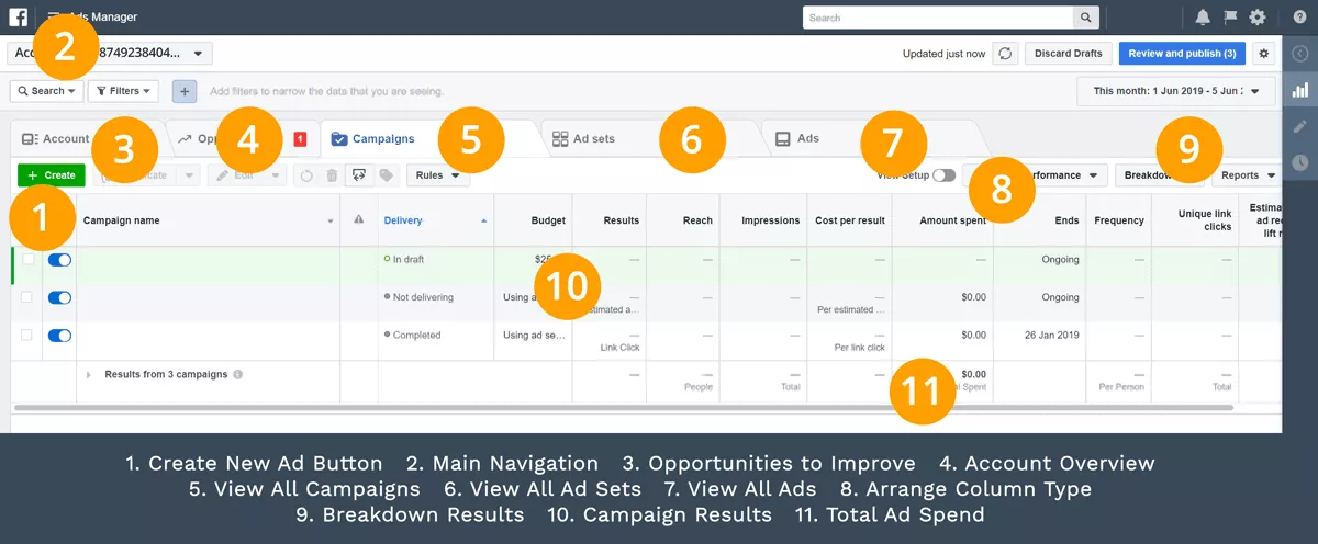 - Campagne : questa è la scheda in cui puoi creare nuove campagne pubblicitarie e rivedere le campagne attive, in bozza, in sospeso e chiuse.