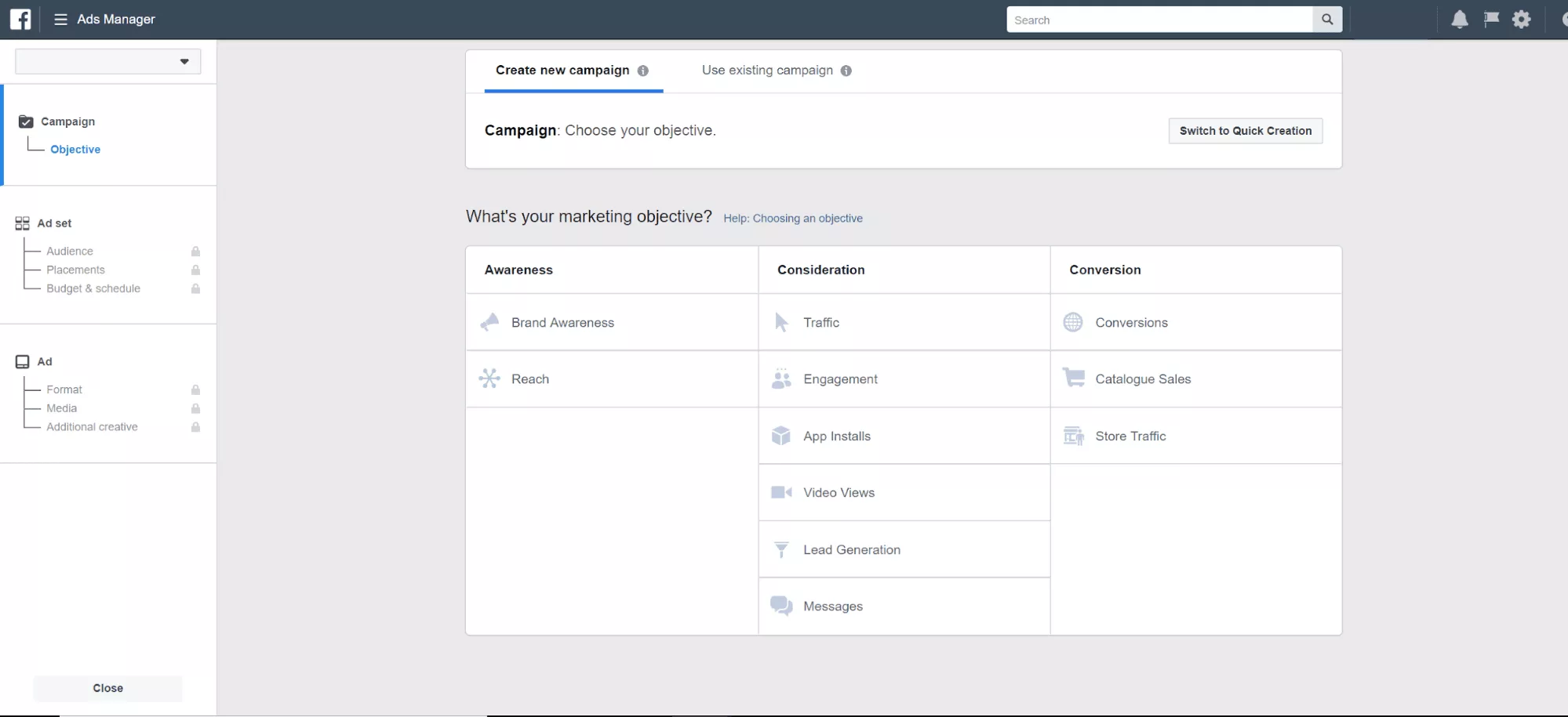 Per iniziare la tua campagna pubblicitaria su Facebook, scegli il tuo obiettivo principale. Ci sono 3 categorie tra cui scegliere: Consapevolezza, Considerazione e Conversioni. Ognuno ha i propri obiettivi specifici per i tuoi annunci.