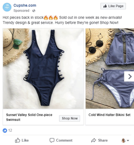 L'annuncio carosello desktop di Cupshe utilizza tutti e 10 gli spazi per le carte per promuovere i loro costumi da bagno più alla moda:
