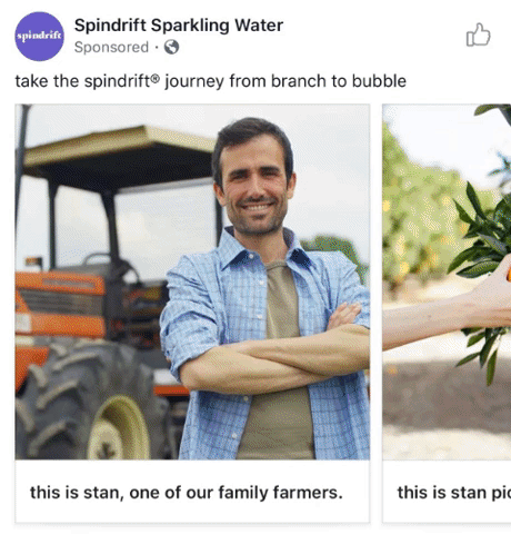 Piuttosto che pubblicizzare un prodotto, Facebook Carousel Ad di Spindrift racconta una storia attraverso immagini sequenziali per costruire la consapevolezza del marchio: