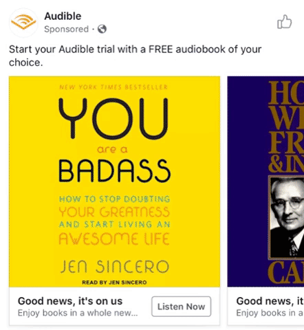 Questo annuncio Audible per dispositivi mobili è probabilmente un annuncio di retargeting perché di recente stavo cercando audiolibri per lo sviluppo personale sul mio telefono, ed è quello che promuovono tutte queste schede carosello: