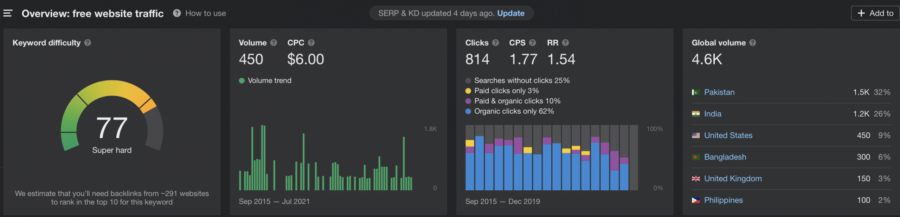 Ad esempio, utilizzando Ahrefs possiamo stimare che la parola chiave "Traffico sul sito web gratuito" dovrebbe ottenere circa 4600 ricerche al mese. Secondo questo studio, la prima posizione su Google ottiene il 33% dei clic, quindi possiamo presumere che se ci classificassimo per questa parola chiave, il post riceverebbe almeno 1518 clic al mese, solo per questa variazione della parola chiave.