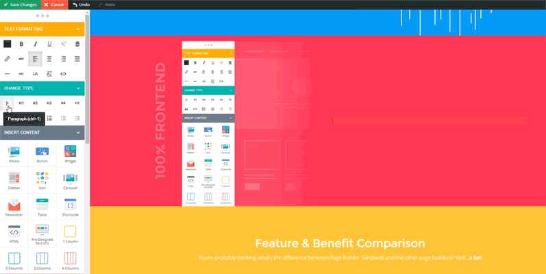 Page Builder Sandwich utilizza 2 GIF per dimostrare la creazione di pagine utilizzando la loro complessa interfaccia plug-in.