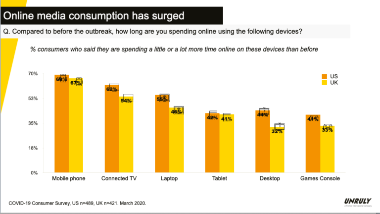 Secondo il "COVID-19 Consumer Survey" di Unruly, il 60% degli intervistati trascorre più tempo con TV on demand, social media, video online, TV in diretta e messaggistica. Ciò significa che è l'opportunità perfetta per gli inserzionisti di raggiungerli dove trascorrono più tempo.