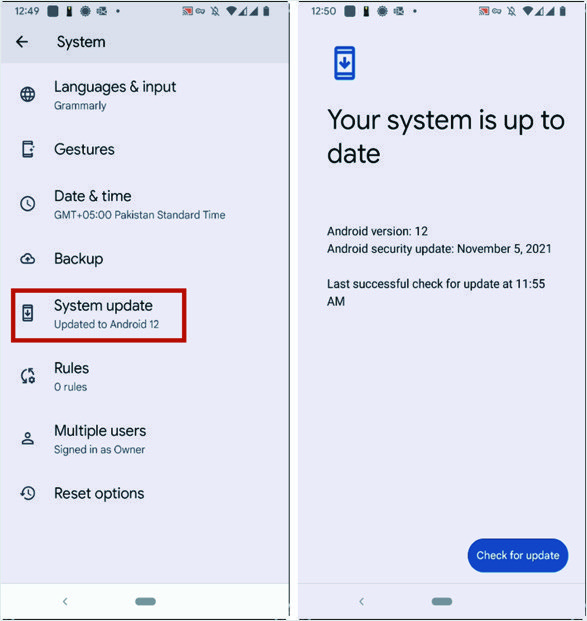 - La schermata successiva mostrerà lo stato del tuo sistema. Mostrerà la versione corrente del tuo Android. Se è già aggiornato, visualizzerà "Il tuo sistema è aggiornato". C'è un pulsante blu "Verifica aggiornamenti" per verificare se sono disponibili nuovi aggiornamenti per il tuo sistema. Se è disponibile un aggiornamento, verrà visualizzato e sarà possibile aggiornare il sistema.