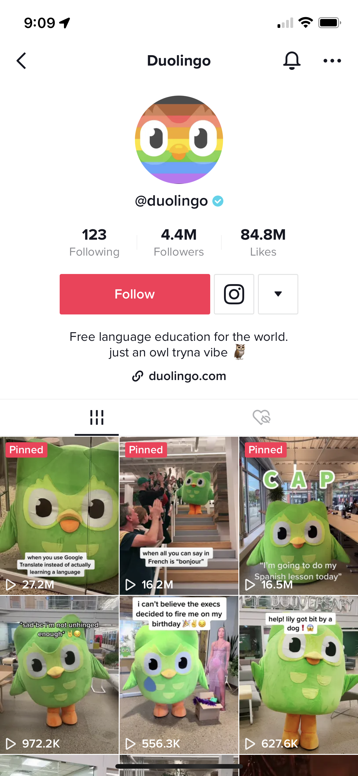 Molte celebrità e noti influencer lavorano per essere verificati, ma è un'ottima idea anche per i marchi. Possiamo vedere il segno di spunta blu di Duolingo che segnala la propria verifica di seguito: