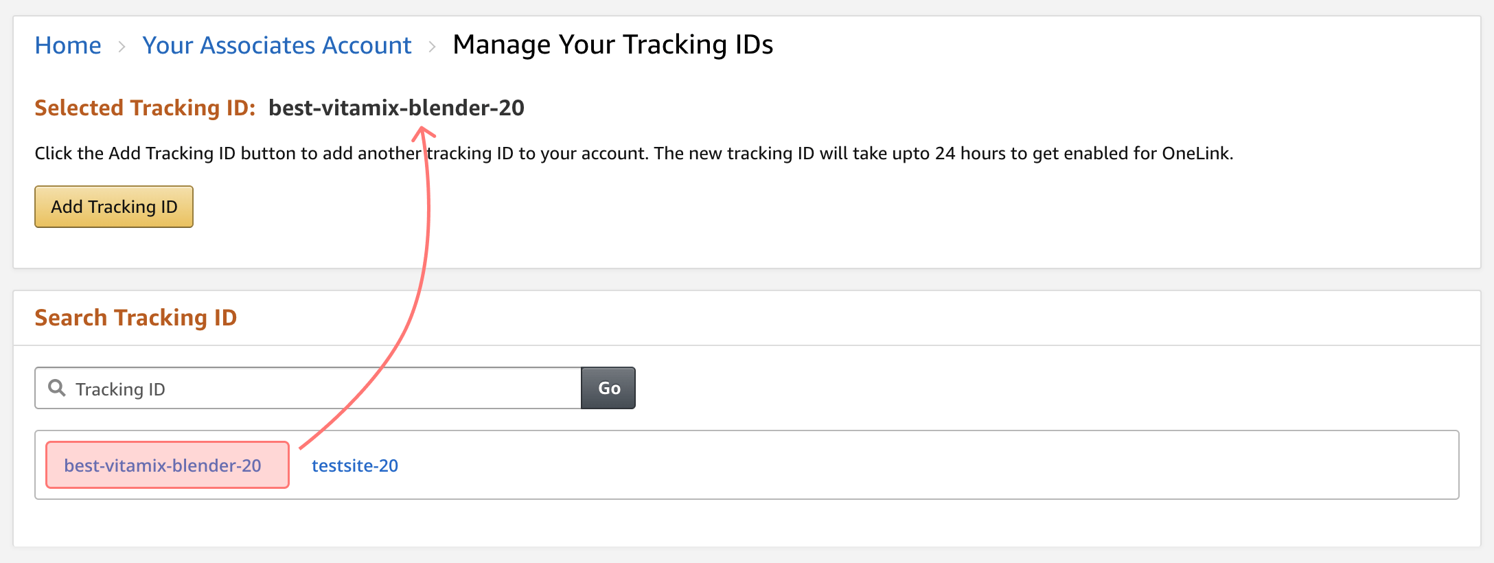 Dopo aver creato e selezionato un nuovo ID di monitoraggio di Amazon Associates, questo verrà incluso in qualsiasi collegamento futuro che creerai.