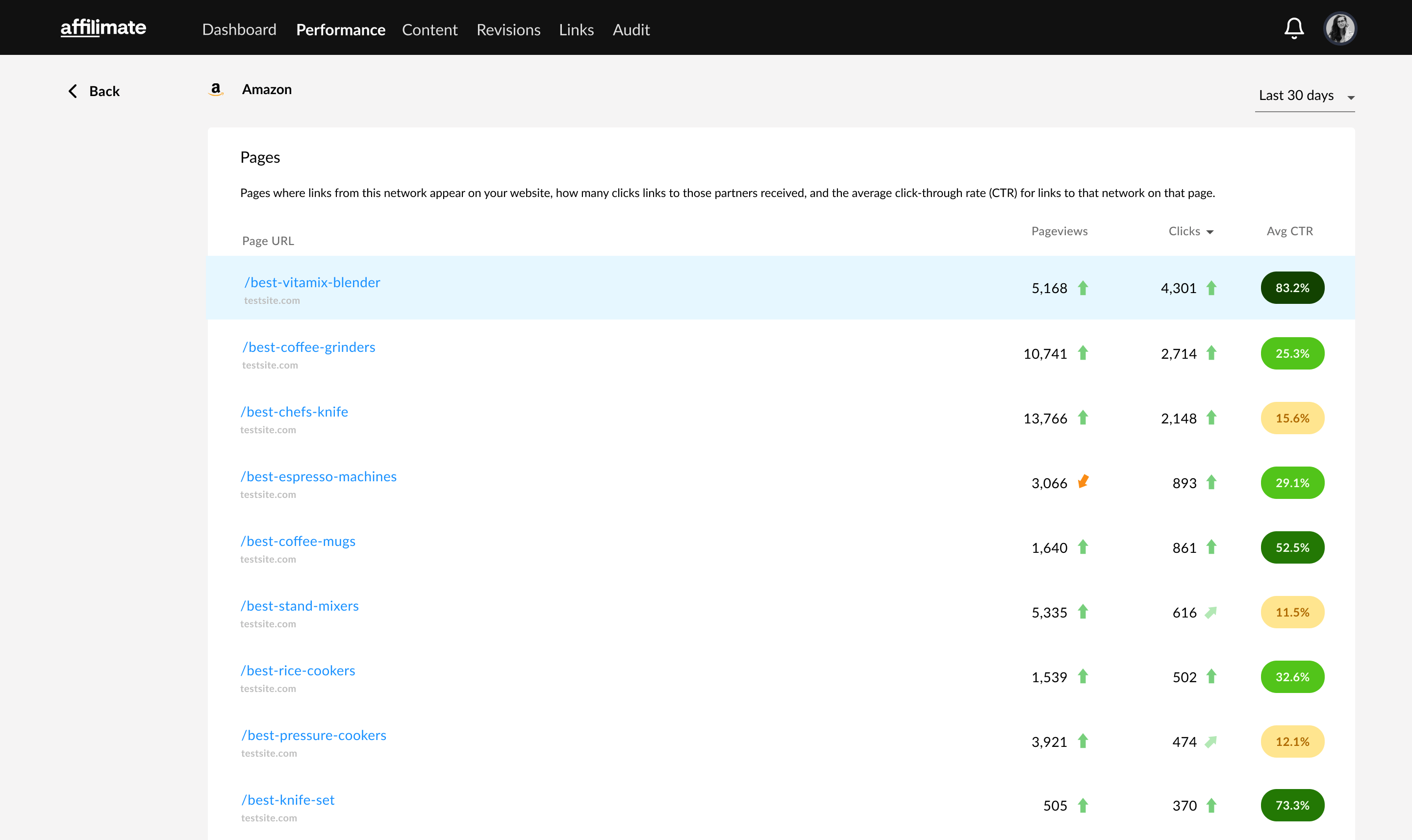 Se ti stai chiedendo da dove cominciare, puoi utilizzare il report di rete di Affilimate per trovare quali pagine hanno più clic sui link di affiliazione Amazon: