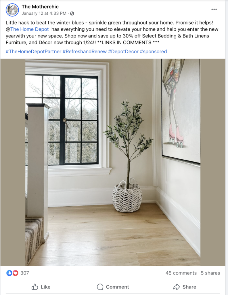 Inoltre, monitorando il traffico del sito web, le aziende possono comprendere meglio l'efficacia dei propri sforzi di marketing e prendere decisioni informate per raggiungere i propri KPI. Home Depot, ad esempio, ha collaborato con la fashion blogger, The Mother Chick, per promuovere i suoi prodotti tramite URL tracciati.
