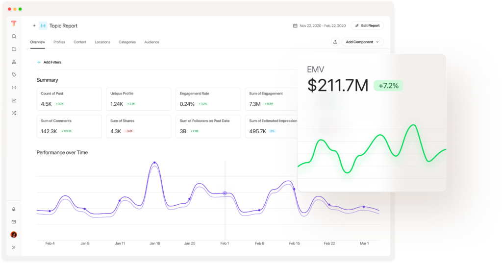 La share of voice (SOV) misura la presenza del tuo marchio rispetto alla concorrenza in modo da poter giudicare la tua posizione nel settore. Usare il SOV come metrica di influencer marketing durante e dopo la campagna ti aiuta a valutarne l'efficacia a livello di mercato.