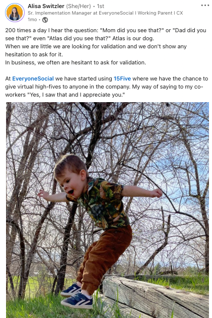 Il bello qui è che i post sui social dei dipendenti non devono necessariamente riguardare l'azienda o il suo prodotto. Quando le tue persone condividono contenuti personali, parlano dei loro interessi o pubblicano le loro competenze o persino gli strumenti che amano, come nell'esempio seguente, questi contenuti continuano a suscitare fiducia e consapevolezza del marchio.