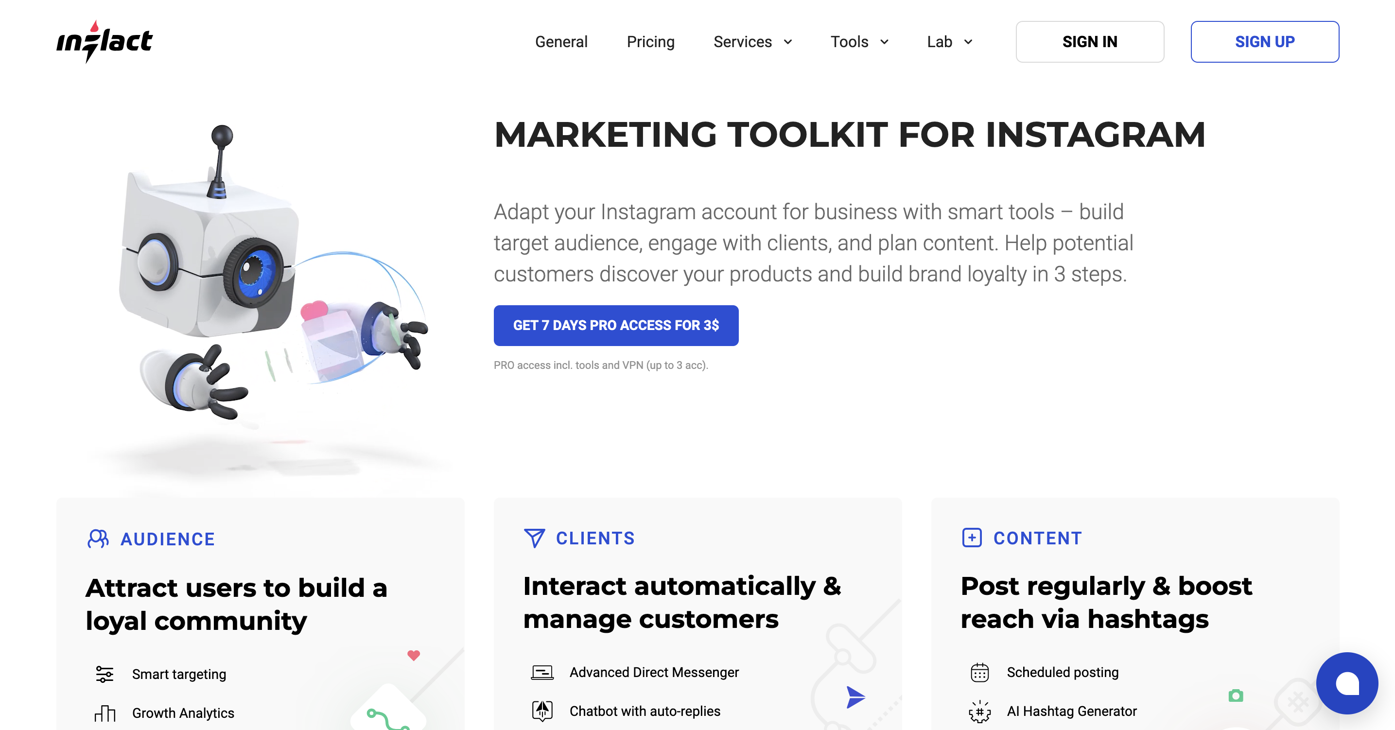 Inflact fornisce un'intera suite di strumenti che possono essere utilizzati per l'automazione di Instagram. Dall'interazione con altri account alla pubblicazione di contenuti, Inflact offre una dashboard intuitiva per accedere a tutte le sue utili funzionalità.
