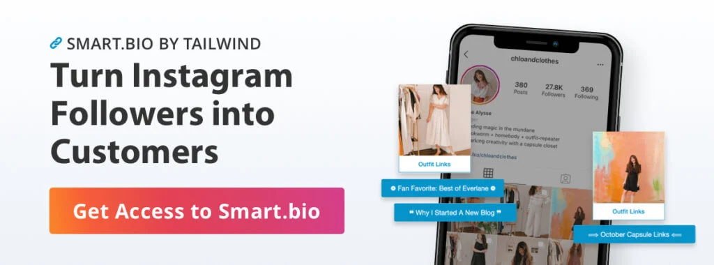 Speri di trasformare i tuoi follower su Instagram in un flusso di traffico e vendite? Prova smart.bio di Tailwind, lo strumento di collegamento in bio più avanzato disponibile! I primi tester come l'influencer dello stile di vita Chloe Alysse hanno già visto risultati sorprendenti con smart.bio: