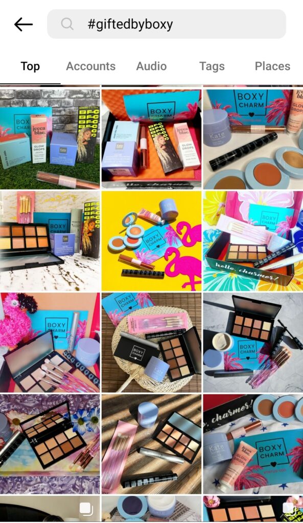 Di seguito è riportato un esempio di BoxyCharm. Le frequenti campagne sponsorizzate e di regali rendono i loro prodotti di bellezza praticamente imperdibili su Instagram.