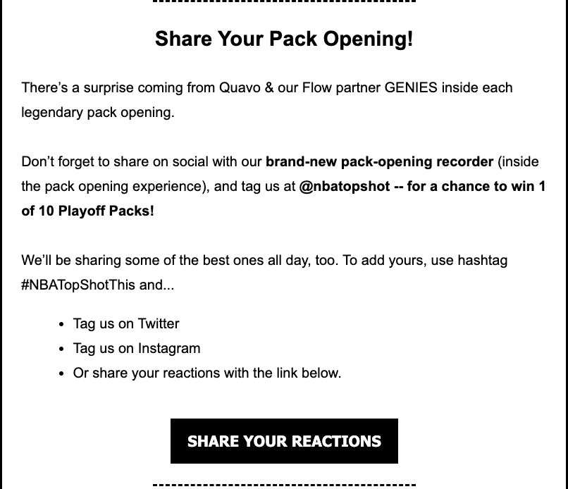 I team del ciclo di vita hanno accesso a una montagna di dati, spesso rilevando chi sono alcuni degli utenti più attivi, più coinvolti e regolarmente ricorrenti di un prodotto o servizio. Sebbene sia probabile che non tutti i super utenti di un prodotto utilizzino i social media, ci sono molte opportunità per spingere questi utenti a condividere pubblicamente le loro esperienze con il prodotto. Adoro questo semplice esempio di NBA Top Shot, che chiede agli utenti in coda di condividere le loro reazioni sui social.