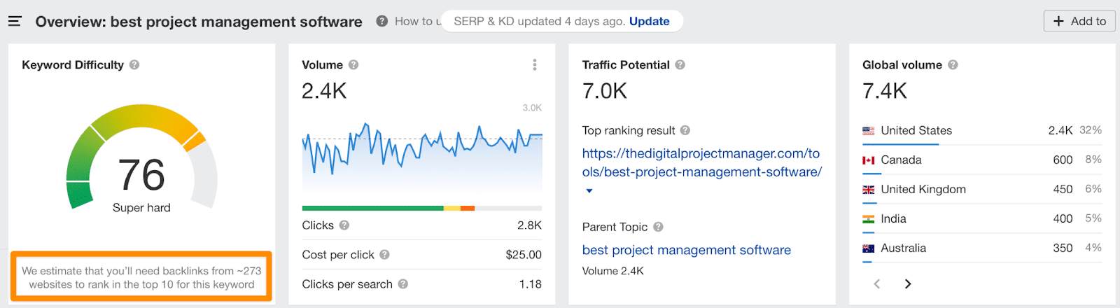 Ahrefs stima che avrai bisogno di ~273 link solo per competere per la prima pagina.