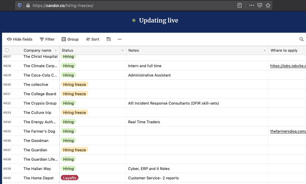 Prendi Candor, che ha fatto centro durante la pandemia con il suo database di congelamento delle assunzioni (questo era l'OG-layoffs.fyi)...