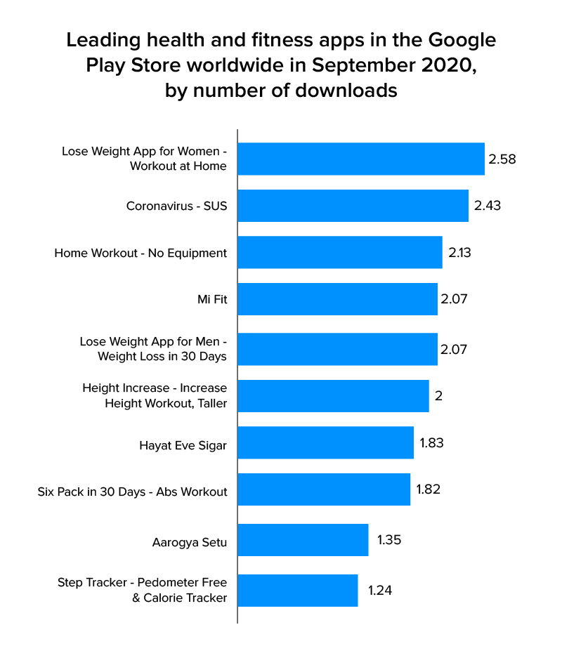 - Un altro rapporto secondo Weforum , afferma che tra il primo e il secondo trimestre del 2020, c'è stata un'espansione dei download di app per la salute e il fitness del 46% in tutto il mondo.