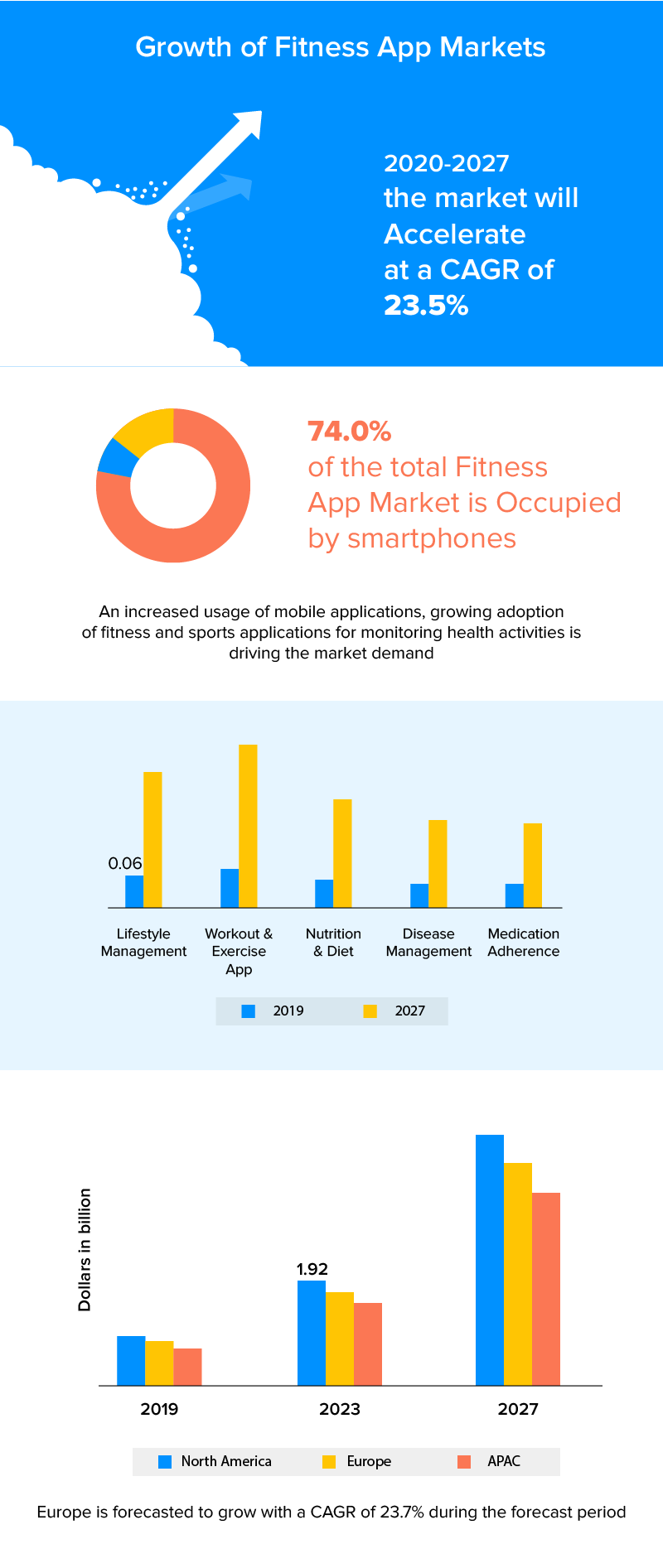- Secondo ReportsandData , si prevede che il mercato delle app per il fitness crescerà a livello globale a un tasso del 23,5% per raggiungere i 14,64 miliardi di dollari entro il 2027.