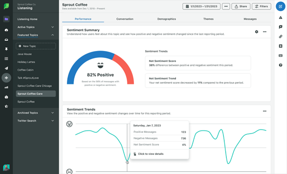 - Utilizza uno strumento di ascolto sociale come Sprout Social per catturare le conversazioni che le persone hanno sul tuo marchio sui social media.