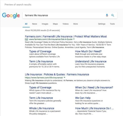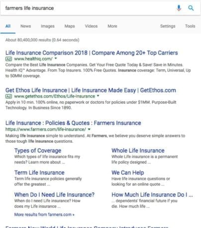 Cose che vuoi considerare con cui sono d'accordo, per Mitch, "le aziende grandi e piccole hanno dipartimenti che lavorano in un silos", questi dipartimenti non hanno competenze trasversali alle discipline. Dalla mia esperienza attraverso le organizzazioni a matrice, sarebbe difficile metterli tutti insieme in una stanza su base regolare. Inoltre, per aggiungere sale a una ferita, i grandi marchi sono stati e continuano a difendere il marchio con la ricerca a pagamento. Sapere che devi difendere il tuo marchio, o un marchio, è un buon obiettivo per i clienti. Devi apportare modifiche alle tue offerte perché a: in quanto marchio, la concorrenza è in vantaggio per i tuoi annunci scadenti oppure b: tu come attività non di marca non sei così rilevante anche con un buon annuncio . In entrambi i casi, aumentando i costi in modo incrementale. La buona notizia è che i marchi riconoscono che un'esperienza utente è indipendente dal canale, quando l'intento è in gioco, ho bisogno di difendere il mio marchio. La cattiva notizia è che una ricerca generica per, ad esempio, l'assicurazione sulla vita campionata sopra, questa volta grazie a HealthIq.com e Getethos.Com, è il motivo per cui le offerte continuano ad aumentare. Aggiungi i guai universali dell'attribuzione, se marchi come Farmers sono vicini a risolvere per il giardino recintato, ma così lontani da una strategia di marketing completa che aiuta nella decisione dell'offerta.